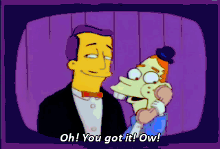 Oh! You got it! Ow! Ow! Ooh, blood. What the-- If this is anyone but Steve Allen, you're stealing my bit. Somebody ought to ruin Gabbo's career the way he ruined Krusty's.