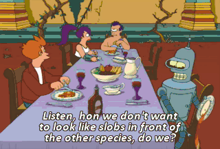 Listen, hon we don't want to look like slobs in front of the other species, do we?