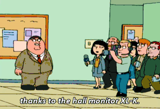 thanks to the hall monitor XL-K. Halt! Present hall pasS! Right here. Second request. Present hall pasS. But... Right here! SecurITy bReach! Security breach!