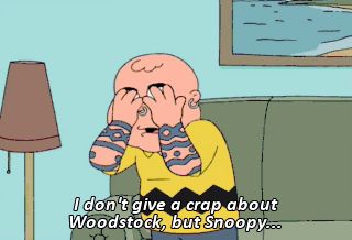 I don't give a crap about Woodstock, but Snoopy... (SOBBING) Get off me, you skank.
