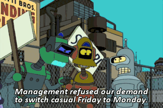 Management refused our demand to switch casual Friday to Monday. What? And now they're hiring scabs at 10 times the normal wage. Ten times normal wage! I'll give those jerks what for!
