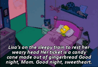 Lisa's on the sleepy train to rest her weary head Her ticket is a candy cane made out of gingerbread Good night, Mom. Good night, sweetheart. Oh, great. The Tuck-in Express is right on time.