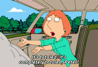 It's totaled. It's completely totaled, Peter! Oh, This is just terrific. How are we gonna get-- Oh, my God! I knew I should have driven. I should always drive. I cannot trust you, Peter Griffin!