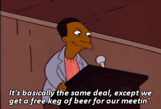 It's basically the same deal, except we get a free keg of beer for our meetin'. Yea! In exchange for that, we have to give up our dental plan.