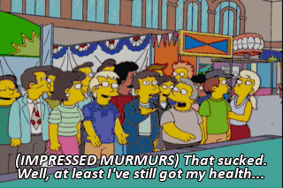 (IMPRESSED MURMURS) That sucked. Well, at least I've still got my health... - (GRUNTS) - (HONKING)