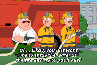 Uh... Okay, you just want me to spray the water at the fire and try to put it out? He knows everything about what we do. Of course he does. Look at that giant horse vagina.