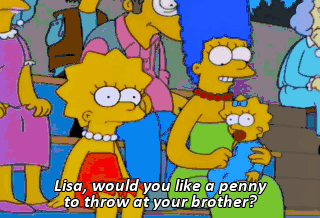Lisa, would you like a penny to throw at your brother? Unbelievable. We're rewarding people for acting like buffoons. Young lady, this may be the high point of Bart's life. Cut him some slack.