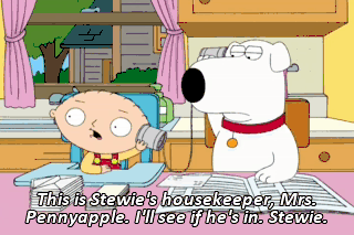 This is Stewie's housekeeper, Mrs. Pennyapple. I'll see if he's in. Stewie.