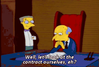 Well, let's look at the contract ourselves, eh? Benefits, perks, a green cookie on St. Patrick's Day? Oh-ho, it didn't use to be this way, Smithers. No, it didn't use to be this way at all.