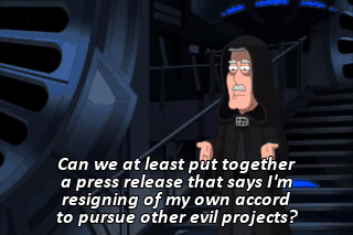 Can we at least put together a press release that says I'm resigning of my own accord to pursue other evil projects?
