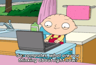 So, computer, what are you thinking about right now? COMPUTER VOICE: Stewie is cool. (WHOOPING)