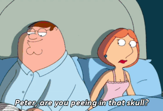 Peter, are you peeing in that skull? No, Lois, I'm getting up and walking all the way to the bathroom and doing it there. Pain in the ass. (THE STAR-SPANGLED BANNER PLAYING ON TV)