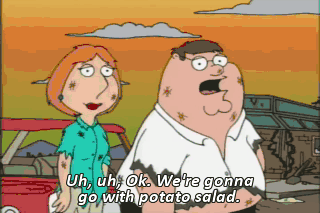 Uh, uh, Ok. We're gonna go with potato salad. Show me potato salad! Maybe we should go now.