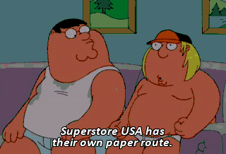 Superstore USA has their own paper route. That new paperboy done gone and broke my sternum. (BOTH MOANING)