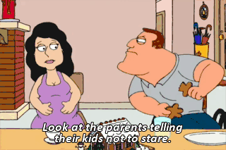 Look at the parents telling their kids not to stare. "How does his pee-pee work, Mommy?" Well, I've got news for you, Becky. Not so well!