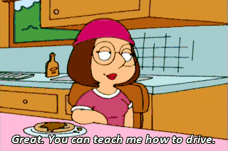 Great. You can teach me how to drive. Meg, There'll be time to drive when you're dead. There's a big world out there just waiting for us to grab it by the short hairs! Damn! Let's go.