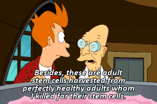 Besides, these are adult stem cells harvested from perfectly healthy adults whom I killed for their stem cells. (GRUNTING)