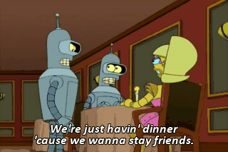 We're just havin' dinner 'cause we wanna stay friends. Ah, I knew that. What I'm actually outraged by is your choice of wine!