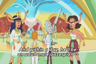 And within a day, he'll be an adult male Gazorpian -- one of the most aggressively violent creatures in the universe. Wait a minute -- we're here because a male Gazorpian was born on our planet.