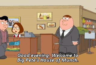 Good evening. Welcome to Big Pete's House of Munch. May I help you? Yes, do you accept the Discover card? (LAUGHS) Hey, Lois. Diamond Jim Brady over here just asked if we accept the Discover card.
