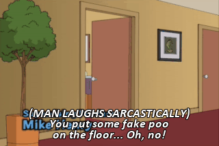 (MAN LAUGHS SARCASTICALLY) You put some fake poo on the floor... Oh, no!