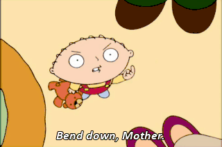No! Bend down, Mother. Yes, honey? How dare you sully my good name by spreading your slanderous filth! Stewie, no hitting! Use your words.