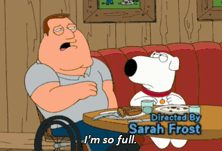 I'm so full. Full of what? Estrogen. Come on, take the skirt off, you pansy.