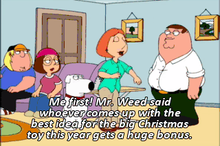 Me first! Mr. Weed said whoever comes up with the best idea for the big Christmas toy this year gets a huge bonus.