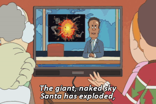 The giant, naked sky Santa has exploded, Biooo’ and chunks of viscera are raining down on the country, Everything should be fine.