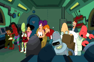 (ZAPP YODELING OVER INTERCOM) (SHUDDERS) FARNSWORTH: And so, as you and Leela kissed goodbye in a tender display of tonguesmanship,