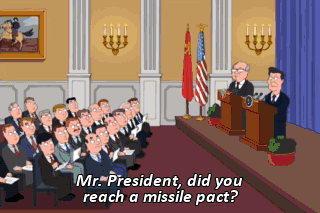 Mr. President, did you reach a missile pact? Well, you could say that. There was a missile and something definitely got packed. (BOTH LAUGHING) Did you discuss ICBMs? Well, I did see a BM.