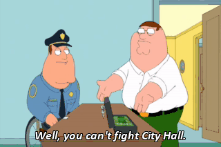 Well, you can't fight City Hall. Oh, we'll see about that! City Hall knows karate. I'm sorry, Peter, but the government makes the rules.