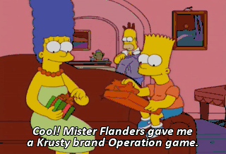 Cool! Mister Flanders gave me a Krusty brand Operation game. (BUZZER SOUNDS) KRUSTY'S VOICE: You just tweezered my wang!