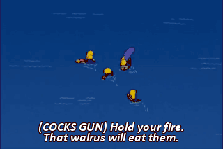 (COCKS GUN) Hold your fire. That walrus will eat them.