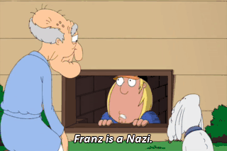 Franz is a Nazi. And he's keeping us prisoner down here. Get help. Oh, and if you see Meg, tell her "Thunder thighs are on the move. Thunder thighs are loose."