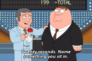 Twenty seconds. Name something you sit in. Chair. Try again. Big chair. No, that's the same thing. Try again. High chair. That's still a chair. Chair. Say something other than "chair."