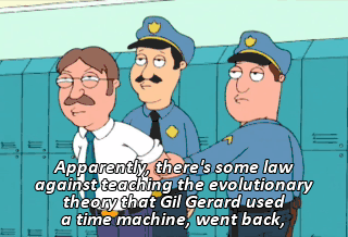 Apparently, there's some law against teaching the evolutionary theory that Gil Gerard used a time machine, went back,