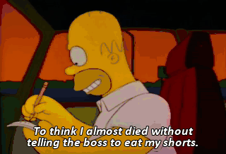 To think I almost died without telling the boss to eat my shorts. Oh, Homer, come on ! You got time for one last beer. Please ! I gotta call Marge. Hah.