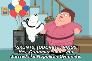 (GRUNTS) (DOORBELL RINGS) Hey, Quagmire. Cool, you dressed like Napoleon Dynamite.