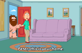 Peter, this is your home. (GRUNTING) This is the couch where you sit. (SNIFFING) Yes, that's the television. Kids, I think he recognizes the TV.