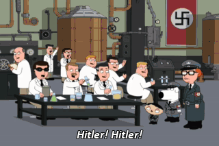 Hitler! Hitler! How's it going, Mr. Hitler? It's a dog-eat-dog Reich, and I'm wearing bacon pants. (LAUGHING) So, how's the atomic bomb coming?