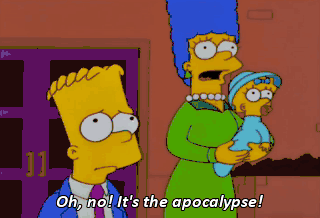 Oh, no! It's the apocalypse! - Bart, are you wearing clean underwear? - Not anymore. It's the rapture! And I never knew true love. I never used those pizza coupons!