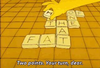 Two points. Your turn, dear. Hmm. How could anyone make a word out of these lousy letters ? Oh, wait. Here's a good one. "Do." "Id." Triple word score.
