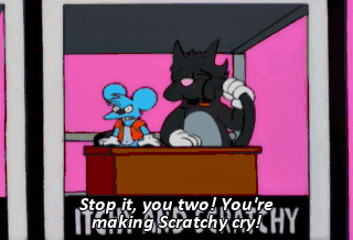 Stop it, you two! You're making Scratchy cry! Oh, we've got to stop putting these flavors of the month on.