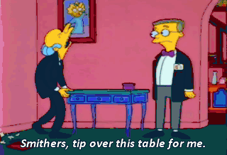 - Smithers, tip over this table for me. - Yes, sir. Homer. Homer. Make them stop. Uh, Mr. Burns. Mr. Burns. Shut up and wreck something. Mr. Burns, I hardly see...