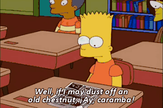 Well, if I may dust off an old chestnut, ¡Ay, caramba! ¡Ay, caramba! indeed. "And so, on November 11th, 1918, the guns fell silent and peace returned. The end." Very good, Bart.