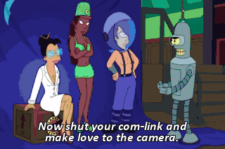 Now shut your com-link and make love to the camera. And remember, I'm the camera. (ELECTRONIC DANCE MUSIC PLAYING)