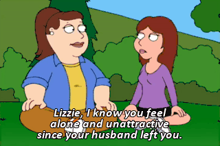 Lizzie, I know you feel alone and unattractive since your husband left you. But you are a beautiful person, and I am here for you. Notice I'm making physical contact with her,