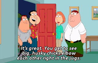 It's great. You get to see big, husky chicks elbow each other right in the jugs.