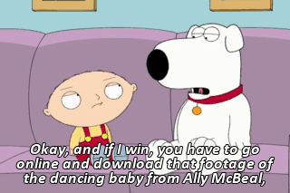 Okay, and if I win, you have to go online and download that footage of the dancing baby from Ally McBeal, and you have to forward it to all your friends with the message,